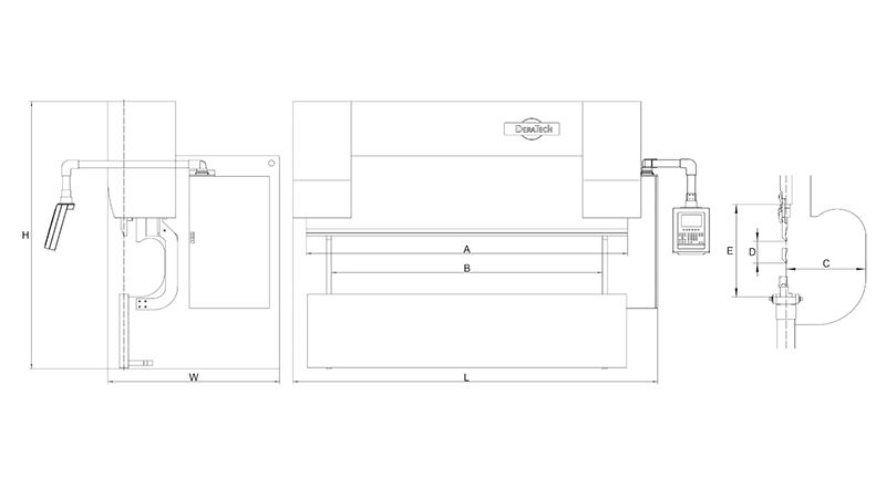 | Model | Lực (kN) | A | B | C | D | E | Công suất chính (kW) | Thể tích dầu (L) | Hành trình trục X (mm) | Hành trình trục R (mm) | Tốc độ tối đa (mm/s) | Kích thước (D*R*C) (mm) | Trọng lượng (kg) |