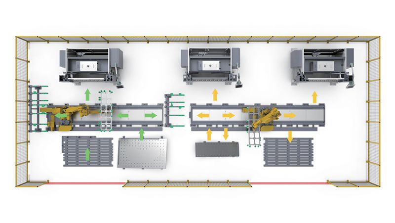 Hệ Thống Sản Xuất Thiết Bị Chấn Kim Loại Tấm Dòng FMS gồm các máy chấn CNC kết hợp với Robot để hệ thống có thể chấn dập tự động các sản phẩm phức tạp. Hệ thống giúp tự động hoàn thành toàn bộ quá trình uốn của sản phẩm đơn giản, giảm các giai đoạn phức tạp ở giữa, cải thiện hiệu xuất, tiết kiệm không gian và tạo điều kiện sản xuất nhanh gọn.